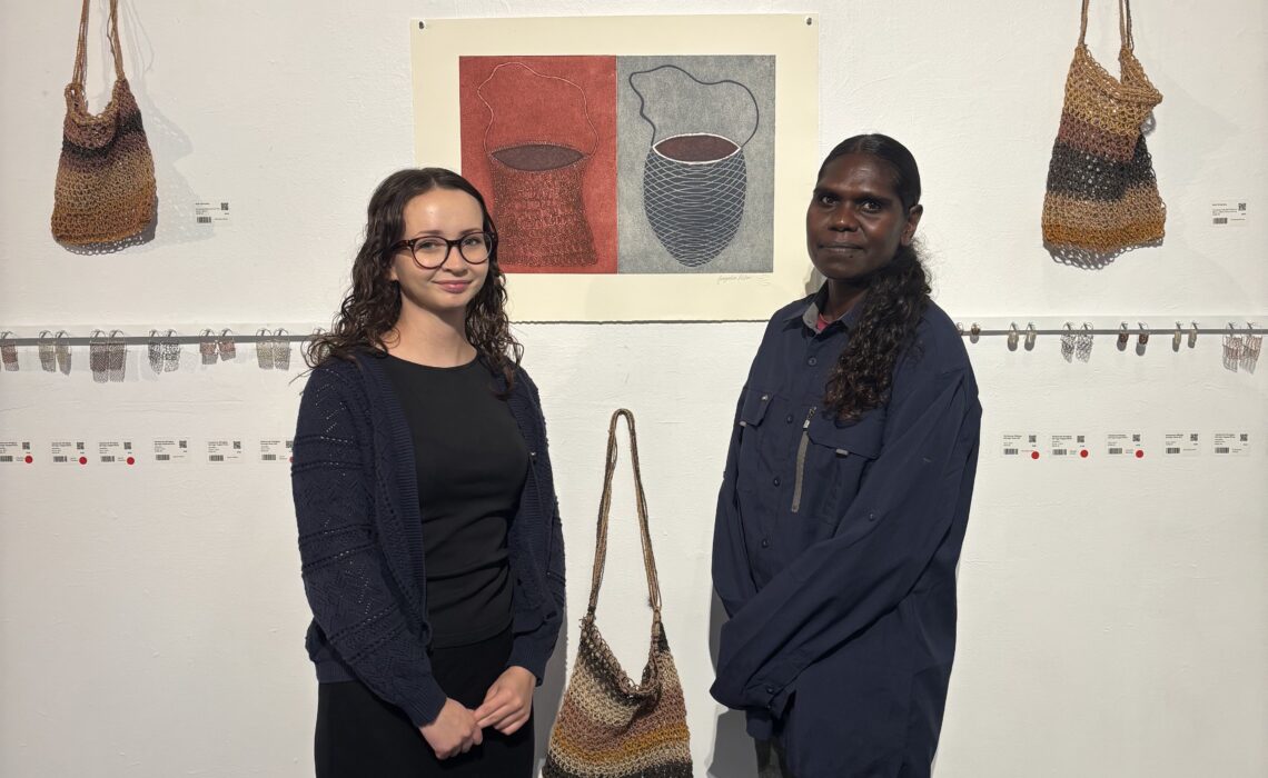 Bathi is Djilpin Arts’ latest exhibition of prints we’ve made together. Also in this exhibition are dilly bags and jewellery, all related to the theme of the ancestral dilly bag. We are excited because the prints were all made during the first workshop to be run for us by Antonia Aitken (assisted by Kari Gilbert) at the community of Wugularr. I have been travelling to this community since 2007, running workshops in silkscreen printing, woodblock, etching and collagraph. Now it’s time to step back from remote delivery, and Antonia and Kari had a great time with 17 of the artists earlier this year, building on their collagraph skills. Kari, in particular, has spent a number of months editioning the collagraph blocks and I have later added the silkscreened colours that some of the artists wanted over a number of their images.