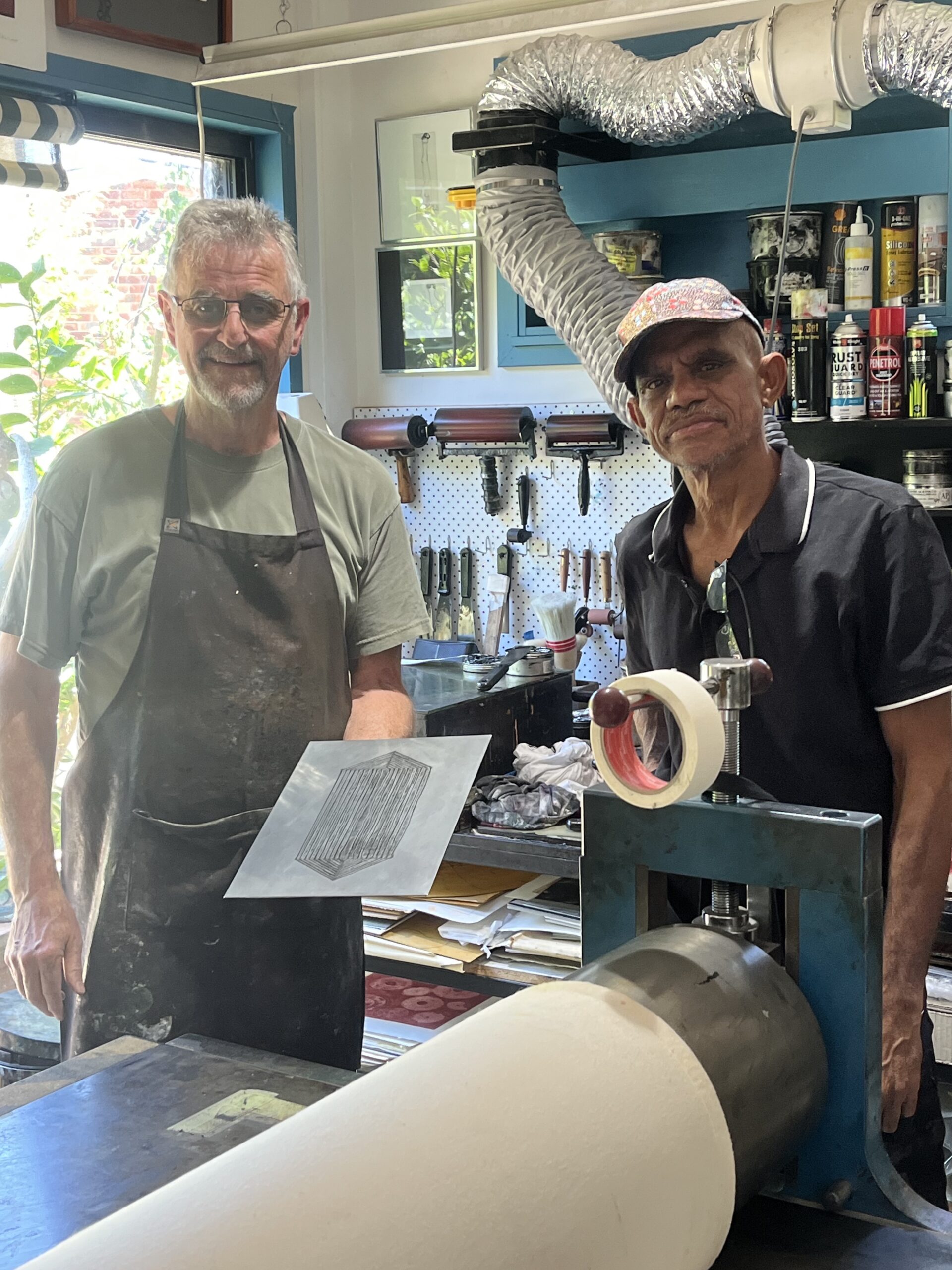 We had already printed a couple of collagraphs that Waringarri artist, Chris Griffiths had sent us last year, so it was really nice to meet him in person in Canberra the other day and even have a few days making some new prints with him and Waringarri Studio Manager, Antonia Aitken. He constructed a collagraph plate first, using string and card and this was then impressed into soft ground on an etching plate. We will show you the results one day, when the edition is made.
