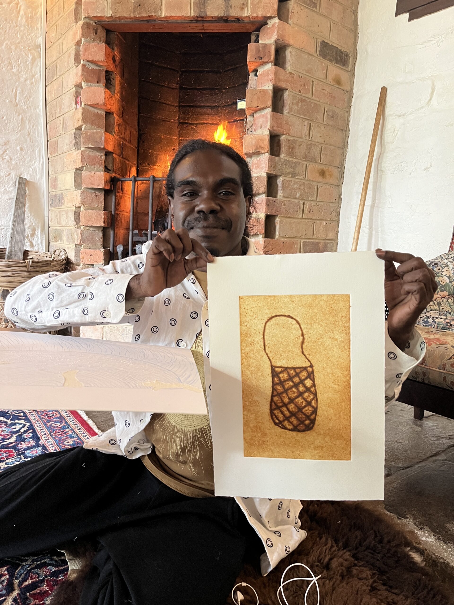 The artists who attended my collagraph workshop at Laughing Waters in November are all experienced weavers and/or image makers, so introducing a new medium didn’t represent a problem to any of them. Printmaking is a medium in which almost any artist can adapt their own existing practice, favourite tools and imagery without having to master “new tricks” necessarily. The collagraph has proven to be particularly accessible to painters, collage artists, sculptors, carvers and weavers. Here is Phillip, an arts worker from Milingimbi Arts Centre in the Northern Territory with one of a number of small pieces he made based on the weaving techniques on his country. We had a small press with us (brought from Canberra), so proofs were able to be made for all the artists during the workshop.