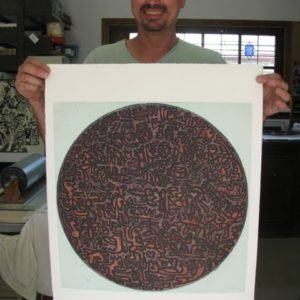 Basil looks surprised after an early colour woodcut rolls off the new press at Mowanjum, north of Derby in Western Australia! The technique used by Leah here is adapted…