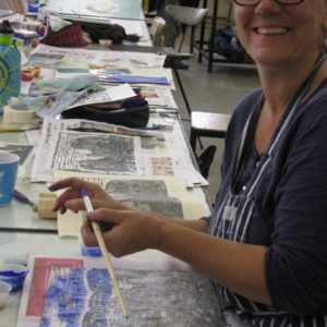 Monica brought a number of grainy found timbers to ink up and her prints comprised a number of layers plus the hand-applied colour – all in two brief days!…