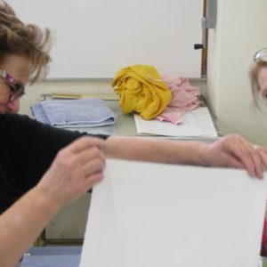 Kate Furness and Warringah printmaking teacher, Susan Baran check out a print as it comes off the press. In fact we only used the presses to glue chine colle…
